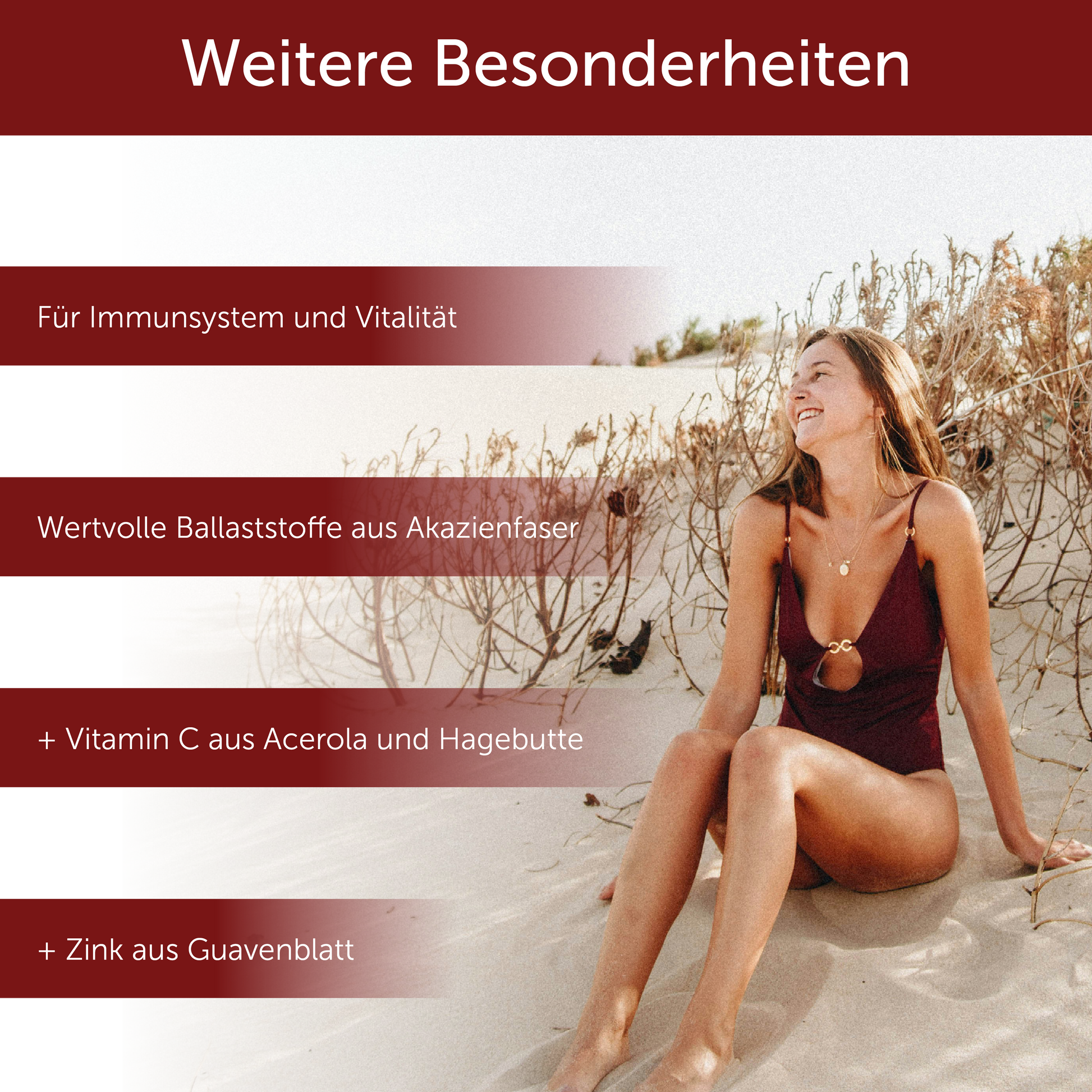 Akazienfaser* 75%, Hagebutten* gemahlen (Fruchtschalen und Kerne der rosa canina, rosa rubiginosa) 17%, Acerolasaftpulver* 6%, Maltodextrin*, Guavenblattextrakt* 1,6%. *aus kontrolliert biologischem Anbau