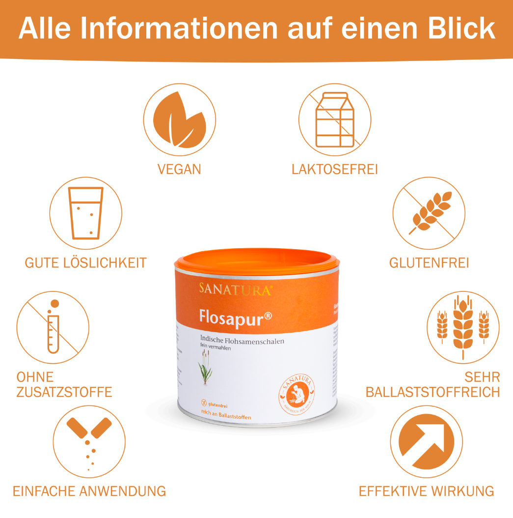 Die Ballaststoffe in Sanatura Flosapur® haben eine erstaunliche Eigenschaft: Sie saugen sich in Verbindung mit Flüssigkeit regelrecht voll – um das 70-fache ihres eigenen Volumens! So entsteht eine Art Gel, das sich im Verdauungstrakt verteilt. Es ist ein wahres Multitalent: dank seiner Schleimstoffe bindet es überschüssige Nahrungsreste und sorgt für einen geschmeidigen Darminhalt. Desweiteren dienen diese Schleimstoffe als Nährstoffquelle für eine gesunde Darmflora. Der Verzehr von Sanatura Flosapur® erhöht das Stuhlvolumen spürbar und regt damit den Druck auf die Darmwand und die Darmmuskulatur an, was wiederum die Darmbewegungen ankurbelt.