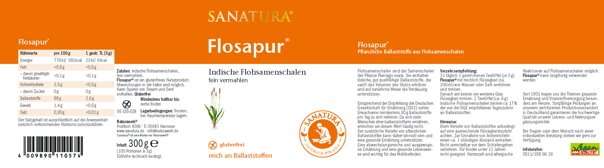 2 x täglich 1 gestrichenen Teelöffel Sanatura Flosapur® (3 g) mit reichlich Flüssigkeit (mind. 250 ml) wie Wasser oder Saft verrühren und trinken. Am besten ein weiteres Glas Flüssigkeit nachtrinken.2 Teelöffel (ca. 6 g) Indische Flohsamenschalen decken ca. 17%* der empfohlenen Tageszufuhr an Ballaststoffen. *Deutsche Gesellschaft für Ernährung Hinweis: Beim Verzehr von Ballaststoffen unbedingt auf eine ausreichende Flüssigkeitszufuhr achten. Für die langfristige Anwendung geeignet.