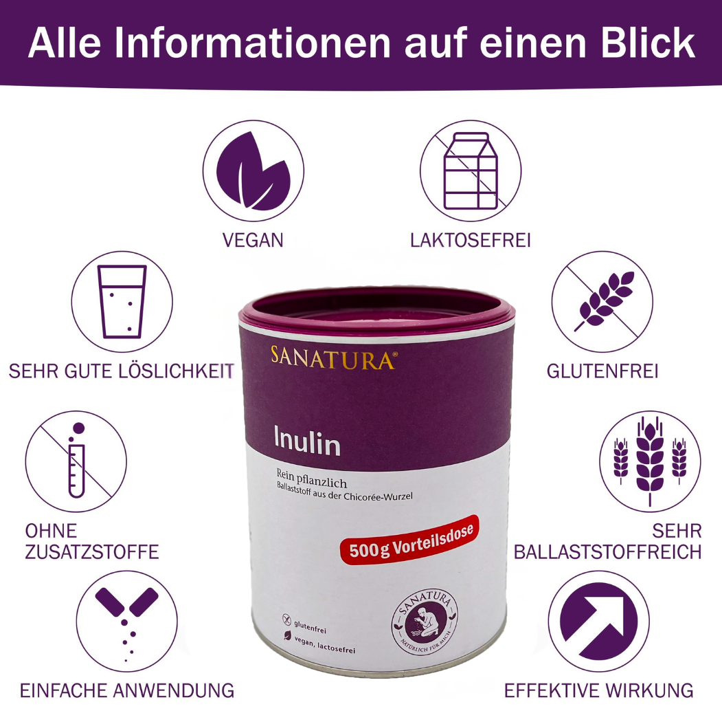 Mit seinem leicht süßen Geschmack ist Sanatura Inulin ideal, um einen Ballaststoffmangel in deiner Ernährung auszugleichen. 12 g Sanatura Inulin täglich - bei Bedarf über den Tag verteilt - erhöhen die Stuhlganghäufigkeit und unterstützen so eine normale Darmfunktion. Außerdem wird dieser Ballaststoff von den Bakterien der Darmflora verstoffwechselt.