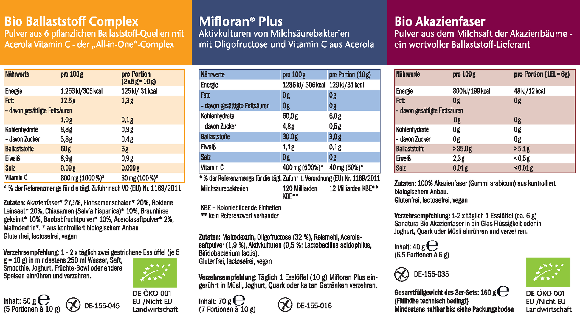 Bio Akazienfaser: 100% Akazienfaser(Gummi arabicum) aus kontrolliert biologischem Anbau. Mifloran Plus: Maltodextrin, Oligofructose (32 %), Reismehl, Acerolasaftpulver (1,9 %), Aktivkulturen (0,5 %: Lactobacillus acidophilus, Bifidobacterium lactis). Bio Ballaststoff Complex: Akazienfaser* 27,5%, Flohsamenschalen* 20%, Goldene Leinsaat* 20%, Chiasamen (Salvia hispanica)* 10%, Braunhirse gekeimt* 10%, Baobabfruchtpulver* 10%, Acerolasaftpulver* 2%, Maltodextrin*. * aus kontrolliert biologischem Anbau